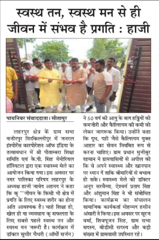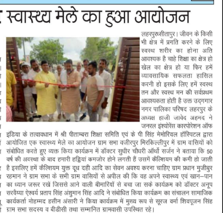 लहरपुर क्षेत्र की ग्राम सभा वजीरपुर कहमारा में जनरल इंश्योरेंस कॉरपोरेशन ऑफ इंडिया के तत्वावधान में श्री पीताम्बरा शिक्षा समिति एवं के.पी. सिंह मेमोरियल हॉस्पिटल द्वारा एक स्वास्थ्य मेले का आयोजन किया गया।
