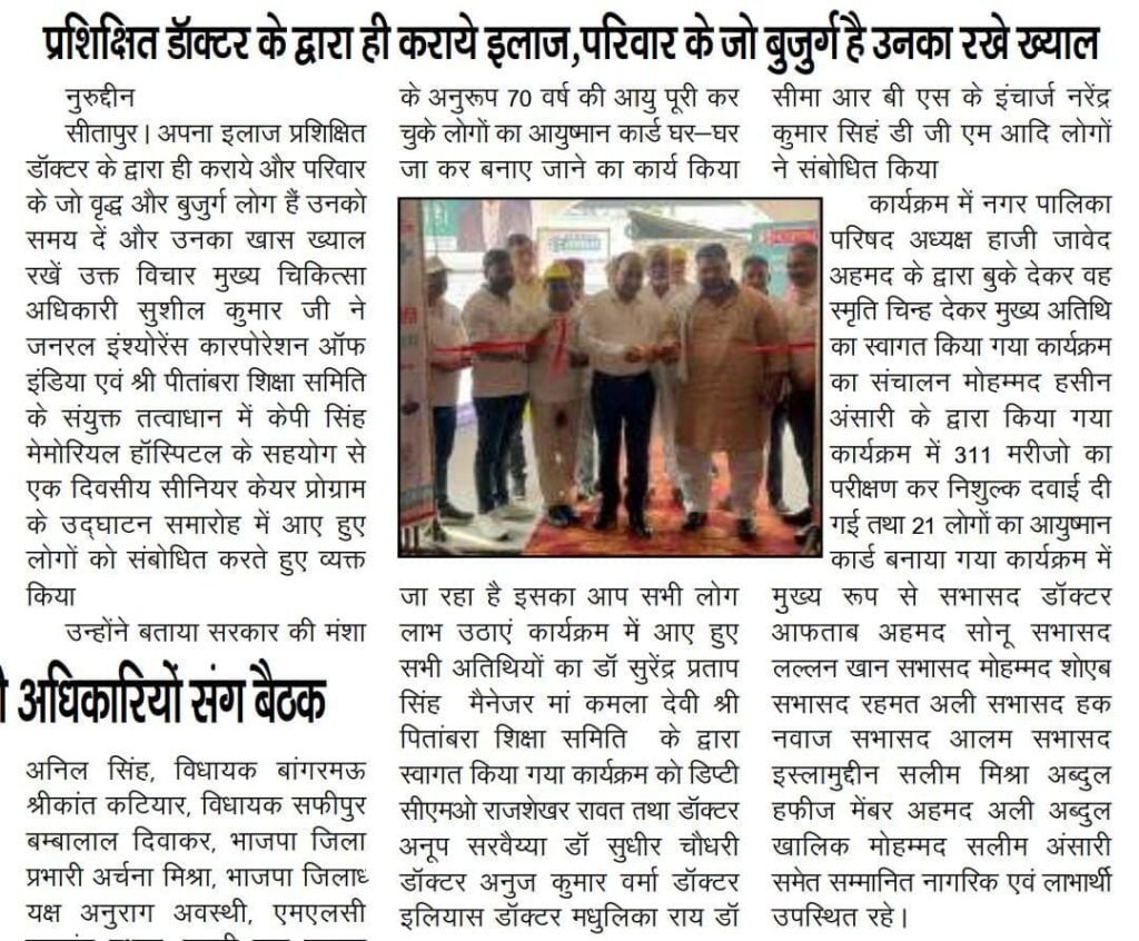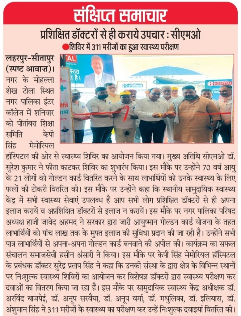 केपी सिंह मेमोरियल हॉस्पिटल के प्रबंधक डॉ. सुरेंद्र प्रताप सिंह ने बताया कि संस्था द्वारा समय-समय पर विभिन्न क्षेत्रों में निःशुल्क स्वास्थ्य शिविर आयोजित किए जाते हैं ताकि ग्रामीण और शहरी क्षेत्रों के लोगों तक बेहतर स्वास्थ्य सुविधाएँ पहुँच सकें।