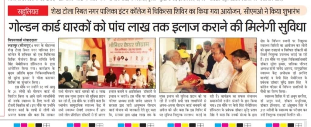 कार्यक्रम का शुभारंभ मुख्य चिकित्साधिकारी (CMO) डॉ. सुरेश कुमार ने फीता काटकर किया। इस अवसर पर उन्होंने 70 वर्ष से अधिक आयु के 21 लाभार्थियों को आयुष्मान गोल्डन कार्ड वितरित किए तथा उपस्थित लोगों को इसके लाभों की विस्तृत जानकारी दी। उन्होंने बताया कि गोल्डन कार्ड धारकों को सरकार द्वारा 5 लाख रुपये तक मुफ्त उपचार की सुविधा प्रदान की जा रही है।