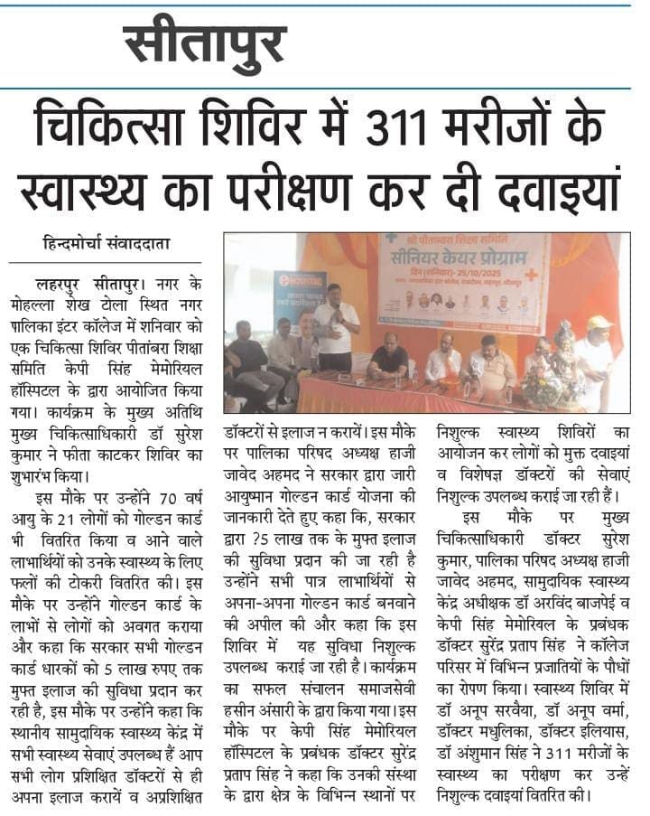 लहरपुर नगर के मोहल्ला शेखटोला स्थित नगर पालिका इंटर कॉलेज में शनिवार को पीतांबरा शिक्षा समिति एवं केपी सिंह मेमोरियल हॉस्पिटल के संयुक्त तत्वावधान में निःशुल्क चिकित्सा शिविर का आयोजन किया गया।